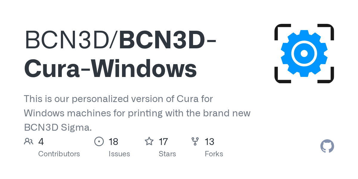 This is our personalized version of cura for windows machines for printing with the brand new bcn3d sigma and the known and loved bcn3d+ and bcn3dr. In the wiki you'll also find the instructions to download and install the latest version of our modified cura. You can also view a handy introduction to bcn3d cura video. We recommend you to check our wiki to search for common questions about the installation and use of the software. To learn bcn3d cura, download the bcn3d cura user manual which also contains a number of "how to tutorials".